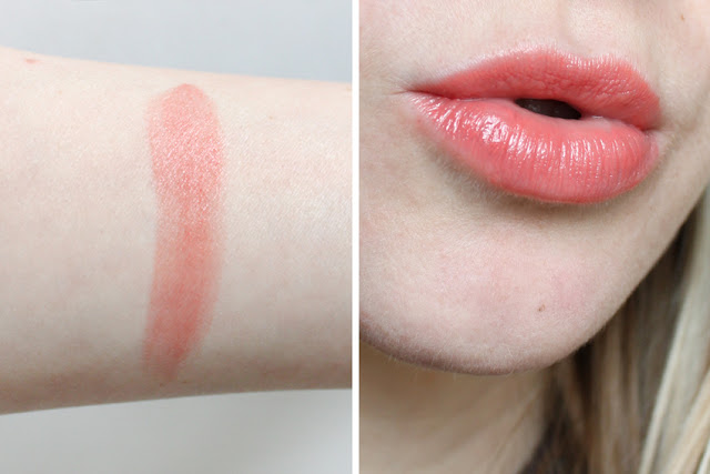 Aber nicht nur die Verpackung, sondern auch das Innenleben kann sich sehen lassen. Es handelt sich um einen rosigen Korallenton, den man sowohl leicht transparent (eine Schicht) als auch deckend (zwei bis drei Schichten) tragen kann. Der Balsam hinterlässt ein leicht glänzendes Finish. Nach ein bis zwei Stunden ist die Farbe von den Lippen verschwunden. Die Pflegewirkung empfinde ich als durchschnittlich gut.