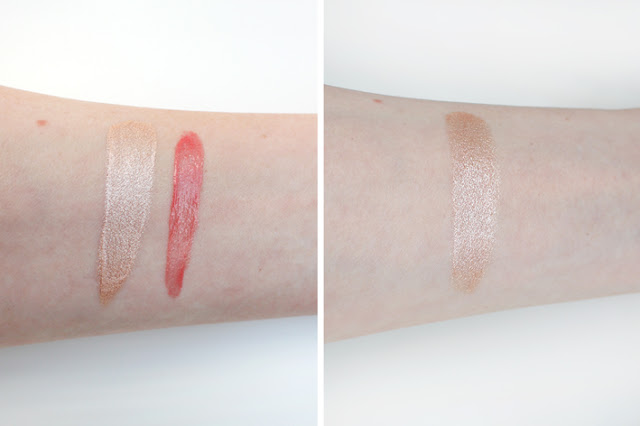 Der Lipgloss peach-pink glamour enthält 8 ml und hat mich 9,95 € gekostet. Im Creme Eyeshadow dusty shine sind 5 ml enthalten bei einem Preis von 6,95 €.