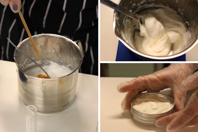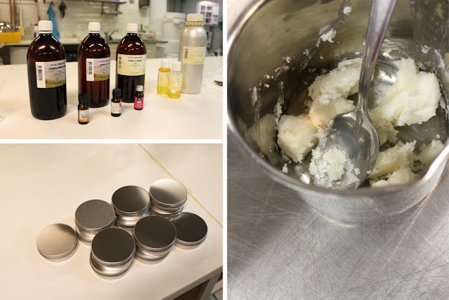 Das Grundrezept von 150g Sheabutter, 5g Arganöl und 6 Tropfen Extrakt aus den Blättern des Rosmarins konnten wir nach belieben mit Ölen und Aromen verfeinern. Um die steife Sheabutter sahnig zu bekommen wurde ein Teil davon auf einer Art Herdplatte erwärmt, mit dem Rest vermengt und mit einem Schneebesen cremig geschlagen. Im Anschluss kamen Arganöl, Rosmarinblattextrakt und die Aromen/Öle hinzu. Ich habe mich für Vanille, Orange und Limette entschieden. Nun wurde noch einmal alles mit dem Handrührgerät gut vermengt und schließlich in die dafür vorgesehenen Aluminiumbehälter abgefüllt. Wer gerne kocht und backt, der wird am Selbstrühren auf jeden Fall seine Freude haben.