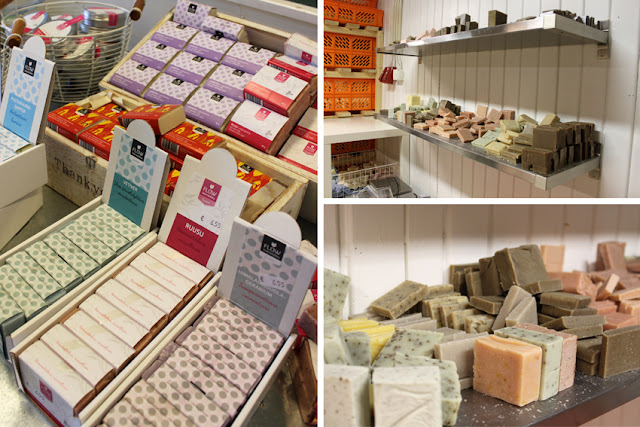 Auf den Bildern seht ihr u.a. einen Teil des Lagers, die Produktionstische und einige Seifen, die gerade in Körben trocknen. Die Seifenreste aus dem Verschnitt werden als Probestücke zu Bestellungen beigefügt. Es werden nicht täglich alle, sondern pro Tag nur etwa 2-3 Produkte (in größeren Mengen) hergestellt. Mit rund 70 verschiedenen Produkten ist die Range für ein kleines Familienunternehmen sehr breit und umfasst Seifen (für Körper, Haar oder Gesicht), Körperpflege, Gesichtspflege, Babypflege, Haarpflege, ätherische Öle und seit Kurzem auch dekorative Kosmetik aus Mineralpigmenten.